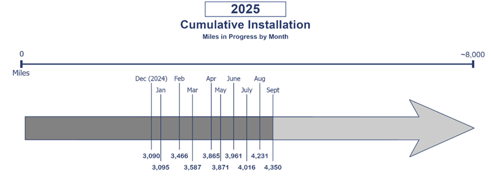 MMBI continues to make significant progress across the state. More than 4,350 miles have gone to installation through CDT’s joint build, IRU/lease, and purchase partnerships, and with Caltrans. Here is the breakdown of updates as of September 2025.