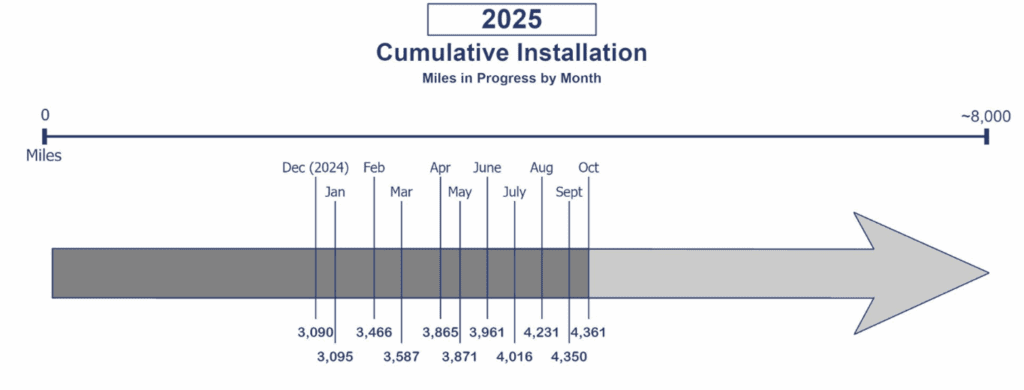 The MMBI continues to make significant progress across the state. Approximately 4,418 miles have gone to installation through CDT’s joint build, IRU/lease, purchase partnerships, and Caltrans. Here is the breakdown of updates as of November 2025: